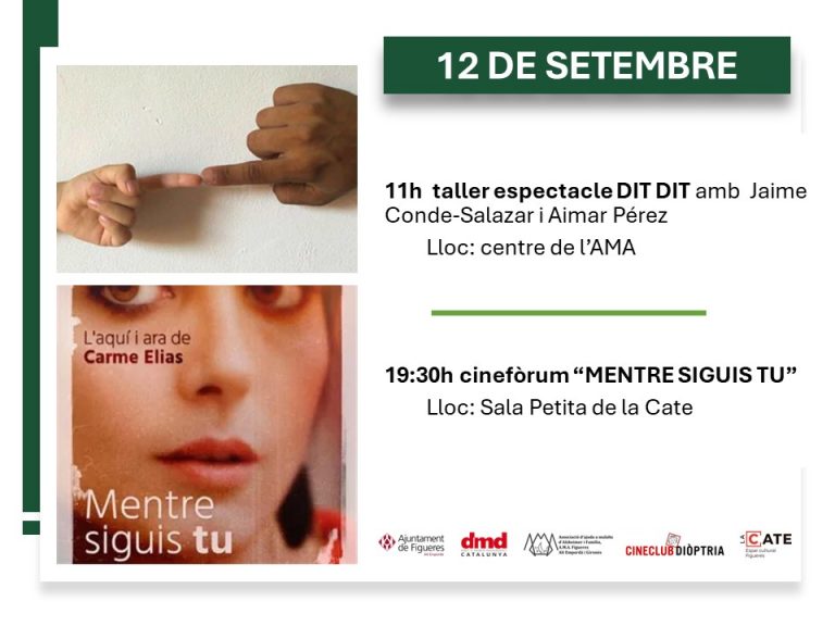 FIGUERES: DIA MUNDIAL Activitats programades per la AFA Figueres el 12 de setembre AFA Figueres ha organitzat dues activitats molt especials per al dijous 12 de setembre.A les 11:00h, en el centre, Jaime Conde-Salazar i Aimar Pérez oferiran el taller-espectacle “Aquest-Aquest” per a usuaris i familiars. A la tarda, a les 19:30h, a la Sala Petita de la Cato, la MESTRESSA i DMD presentaran el documental “Mentre siguis tu” de Carme Elias, seguit d’un debat que promet ser molt enriquidor. No us ho podeu perdre! Us esperem!! Relacionats