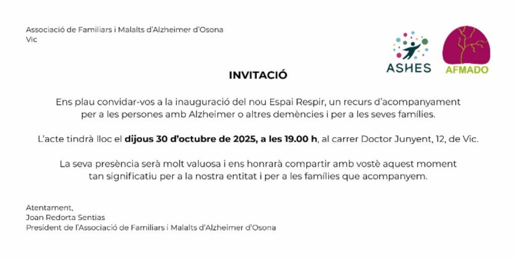 Ens fa molta il·lusió convidar-vos a la inauguració que tindrà lloc la inauguració del nou Espai Respir de l’Associació de Familiars i Malalts d’Alzheimer d’Osona (AFMADO), ubicat al carrer Doctor Junyent, 12, de Vic. Aquest nou recurs vol oferir acompanyament i suport a persones amb Alzheimer o altres demències i a les seves famílies. L’acte s’emmarca en els actes del Dia Mundial de l’Alzheimer, posant en valor la importància de crear espais de cura, atenció i respir per a les famílies afectades.